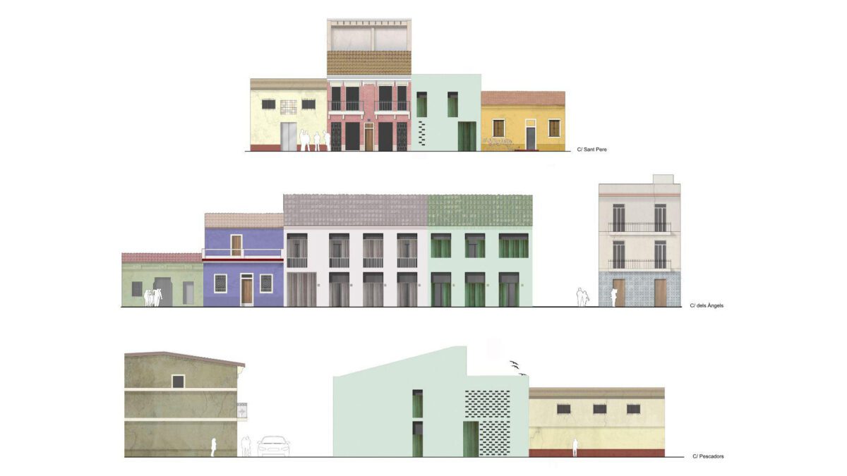 El proyecto, elaborado por la empresa Desarrollo de Proyectos Nheo, contempla la construcción de dos edificios conectados mediante un patio interior, con fachada a las calles dels Àngels, dels Pescadors y Sant Pere. En total, contará con 16 viviendas y un espacio comunitario de uso compartido, pensado para fomentar la convivencia y la inclusión.
